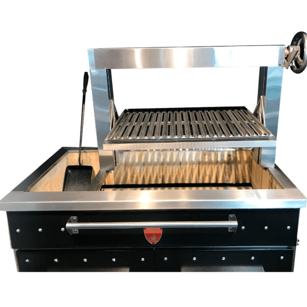 Parrilla abierta tipo Argentina JGM GRILL. Trabaja a  carbón vegetal y similares, cuenta con una superficie de cocción amplia, abierta y elevable, que le permite al parrillero graduar los alimentos a la distancia exacta de la brasa, a fin de obtener una cocción óptima de diferentes términos de braseado.